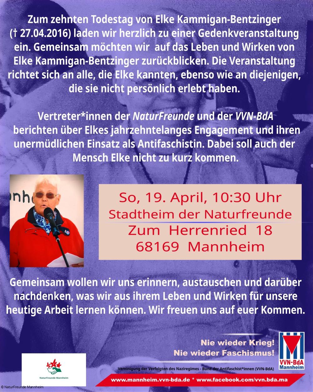 Zum zehnten Todestag von Elke Kammigan-Bentzinger († 27.04.2016) laden wir herzlich zu einer Gedenkveranstaltung ein. Gemeinsam möchten wir auf das Leben und Wirken von Elke Kammigan-Bentzinger zurückblicken. Die Veranstaltung richtet sich an alle, die Elke kannten, ebenso wie an diejenigen, die sie nicht persönlich erlebt haben. Vertreter*innen der NaturFreunde und der VVN-BdA berichten über Elkes jahrzehntelanges Engagement und ihren unermüdlichen Einsatz als Antifaschistin. Dabei soll auch der Mensch Elke nicht zu kurz kommen.